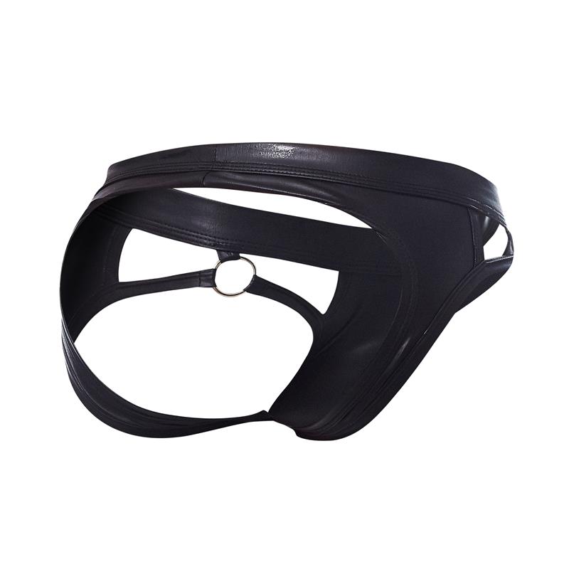 Este jockstrap cuenta con una parte delantera moderna, con aros y aberturas en los laterales, con la parte trasera abierta.