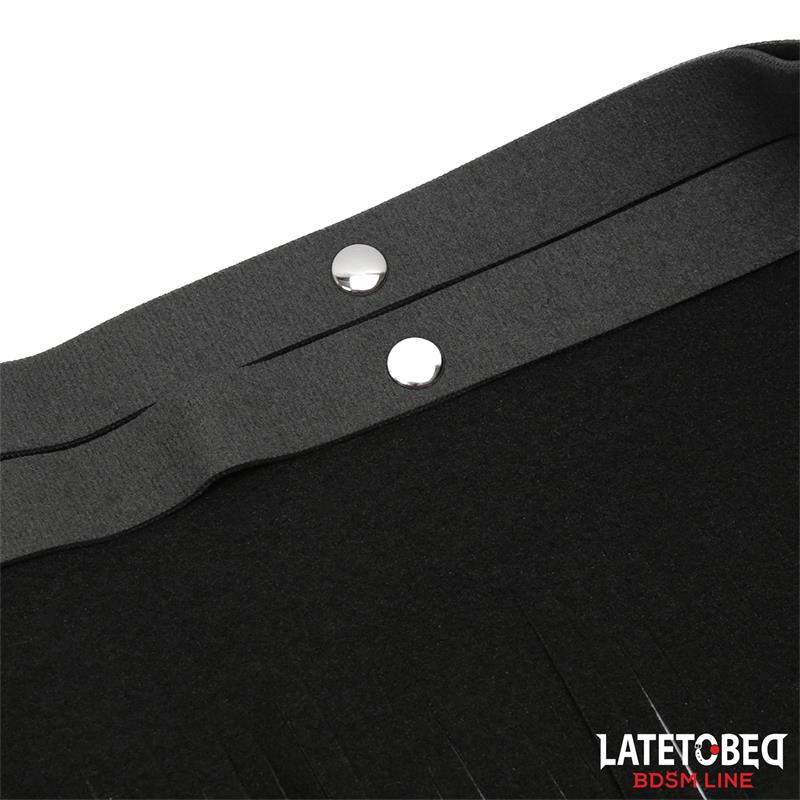 Incluye en tu colección esta falda de flecos Bondage. Cuenta con una cintura con dos tiras con hebillas ajustables, y con la parte delantera abierta.