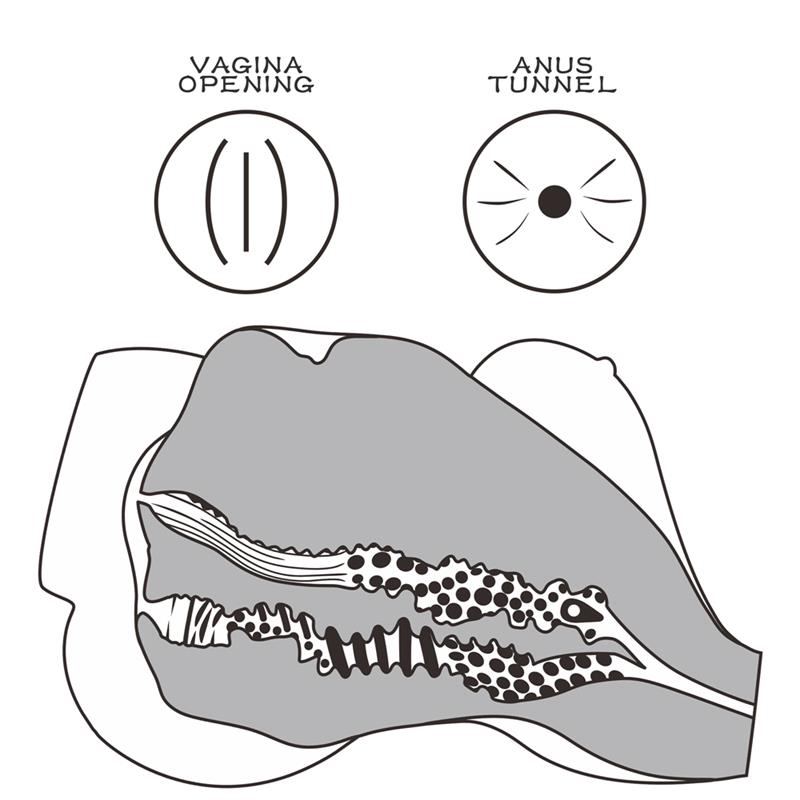 Su túnel vaginal cuenta con una serie de protuberancias para aumentar el placer mientras te deslizas profundamente dentro de ella. Al mismo tiempo cuenta con un orificio anal mucho más estrecho lleno de numerosas curvas.