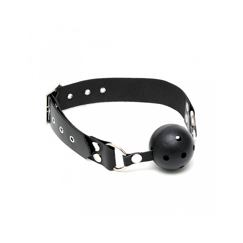 Mordaza de cuero con una bola de plástico hueca de 4,4 cm. Esta mordaza se cierra en la parte posterior con una hebilla de metal en 8 posiciones. Tiene 3 cm de ancho el collar.