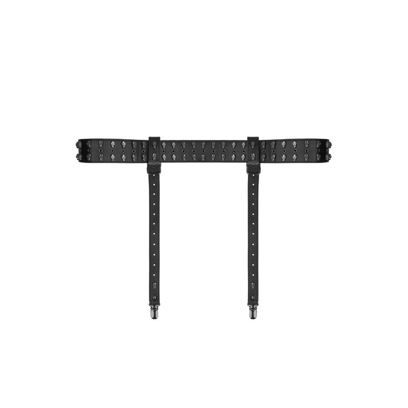 Este liguero negro es increíblemente sensual pero, ¿por qué no darle un poco de caña? Fabricado con piel sintética negra de alta calidad está adornado con calaveras.