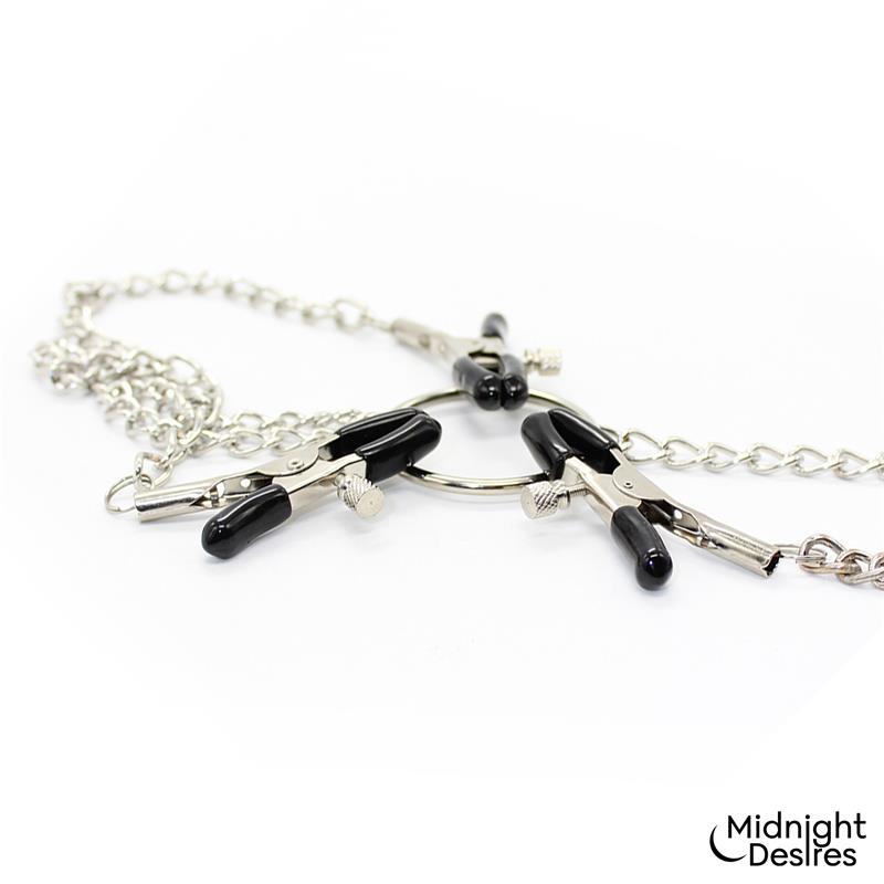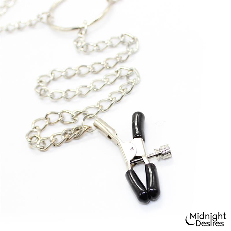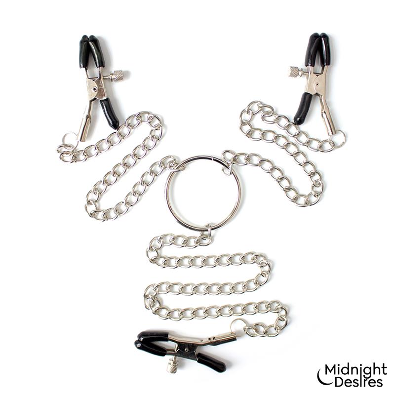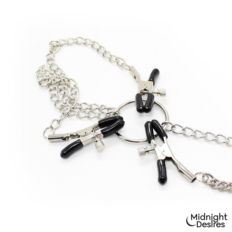 ¿Quieres experimentar el placer real? Prueba este set con pinzas para pezones y clítoris. Estas pinzas van unidas con una cadena, lo que es ideal para añadir un toque extra de diversión a vuestros encuentros, y las pinzas son clásicas y ajustables.