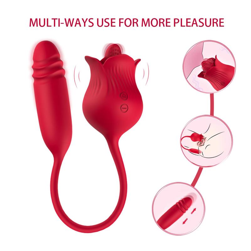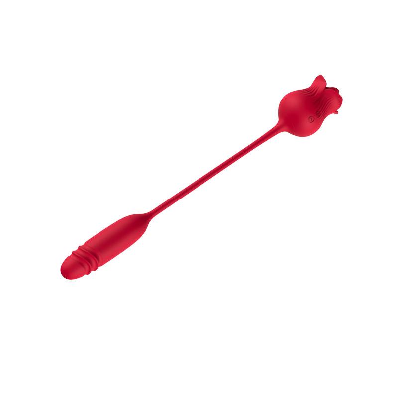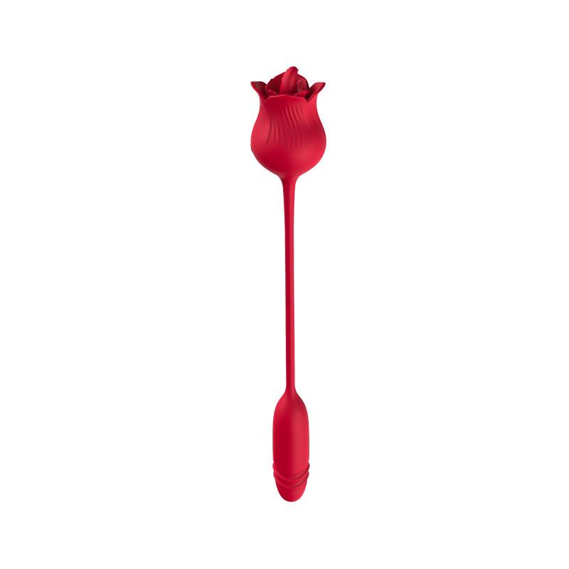 Un juguete con el que disfrutar de mil maneras posibles. En la parte superior un estimulador con forma de rosa con 10 funciones de movimiento licking o lengua, y en la parte de abajo un huevo vibrador con 10 funciones de vibración y de movimiento up and down o thrusting.